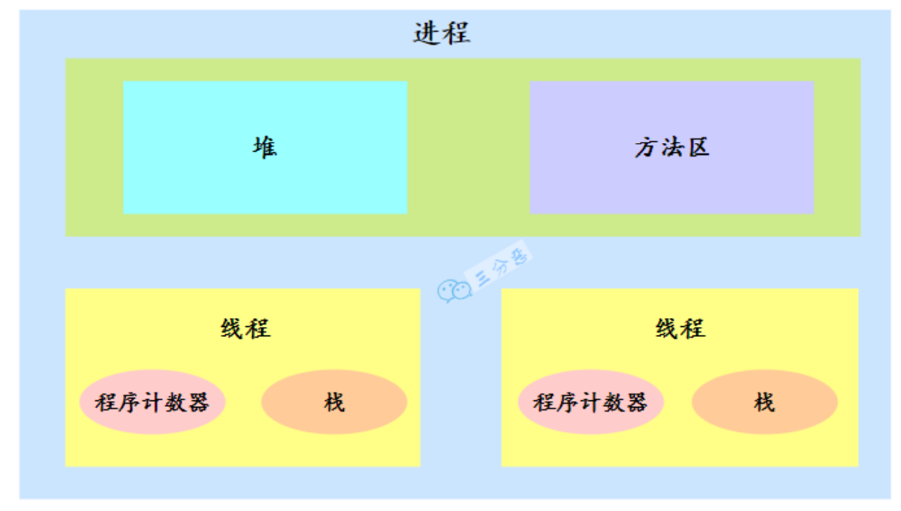 一个进程中有多个线程,多个线程共用进程的堆和方法区资源,但是每个线程有自己的程序计数器和栈。