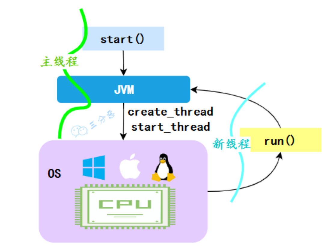 JVM执行start方法,会先创建一条线程,由创建出来的新线程去执行thread的run方法,这才起到多线程的效果。